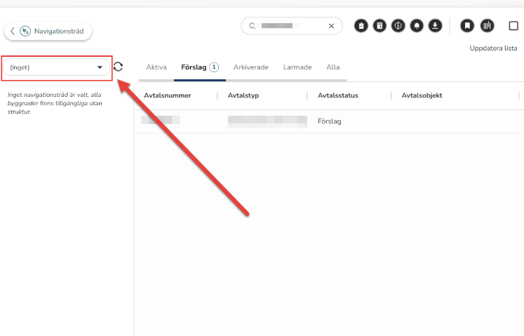 Om förslaget inte syns i listvyn kan det bero på att det ligger under ett annat navigationsträd med namnet ”(Inget)”. Detta händer när fältet Avtalsobjekt är tomt – då finns inget kopplat objekt, vilket gör att förslaget inte placeras i det vanliga navigationsträdet, utan istället hamnar under ”(Inget)”.