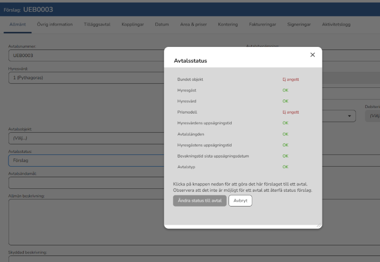 Ett förslag skapas när du trycker på knappen för att skapa ett avtal. Avtalet behöver sedan fyllas på med följande information innan du kan ändra avtalsstatus från "förslag" till "avtal":
