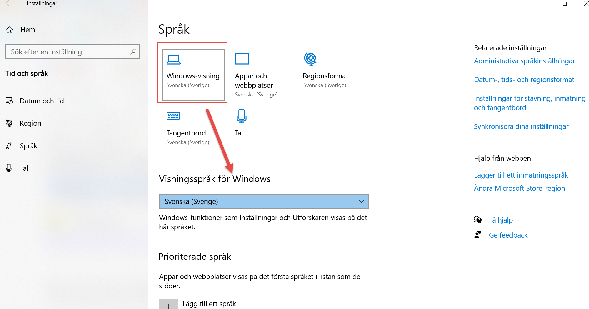 2. Verifiera Visningsspråk i Windows - ska vara svenska. (Om du inte har svenska inställt, ändra till svenska)