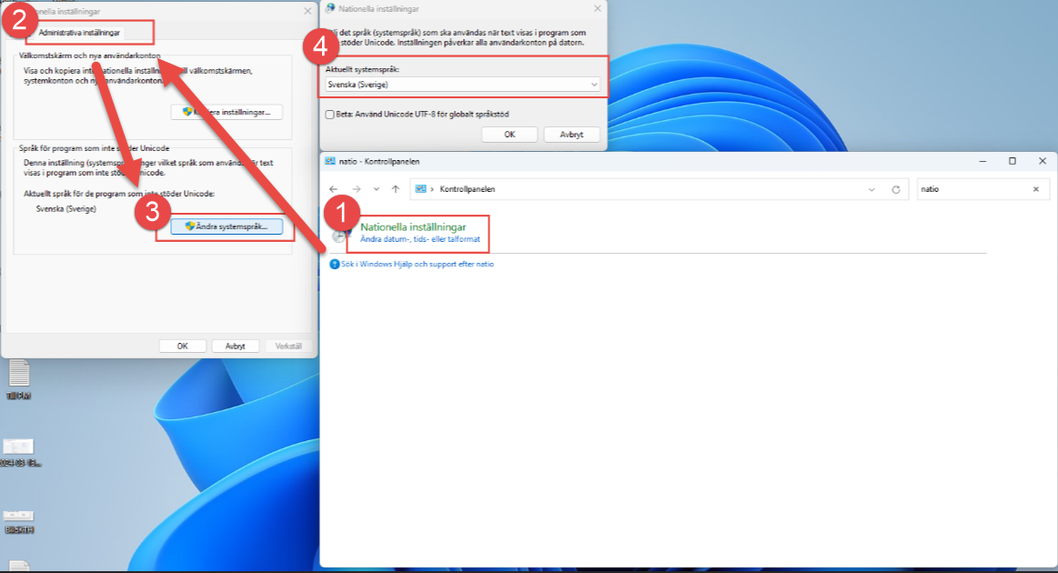 1. Verifiera Systemspråk i Windows - ska vara svenska. (Om du inte har svenska inställt, ändra till svenska)